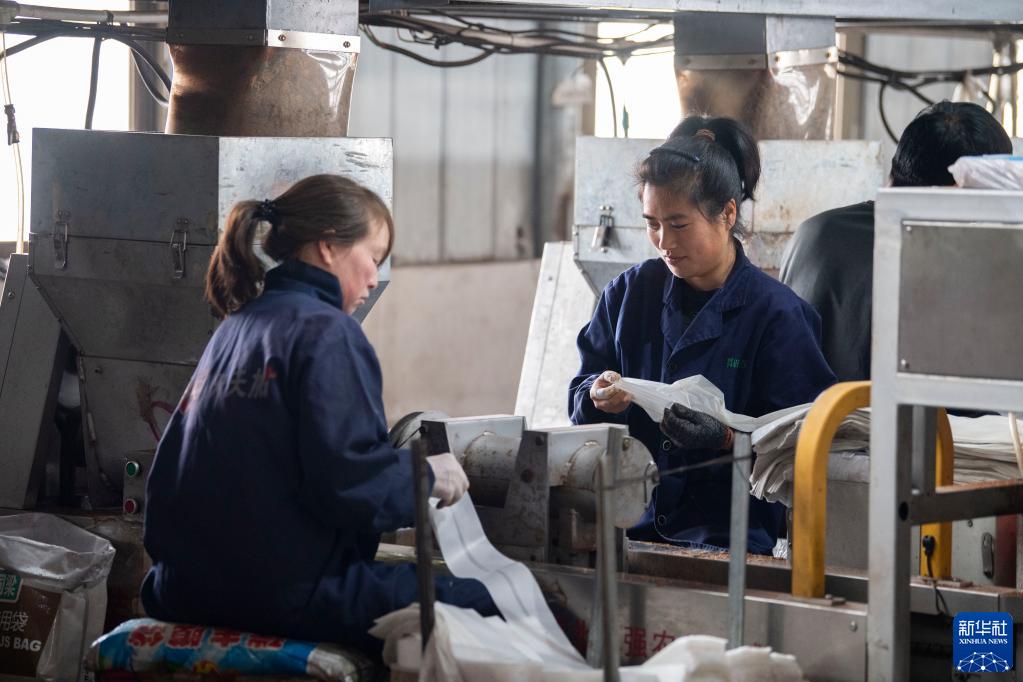 2月23日,工作人員在萬(wàn)榮縣香菇產(chǎn)業(yè)園內加工菌棒。