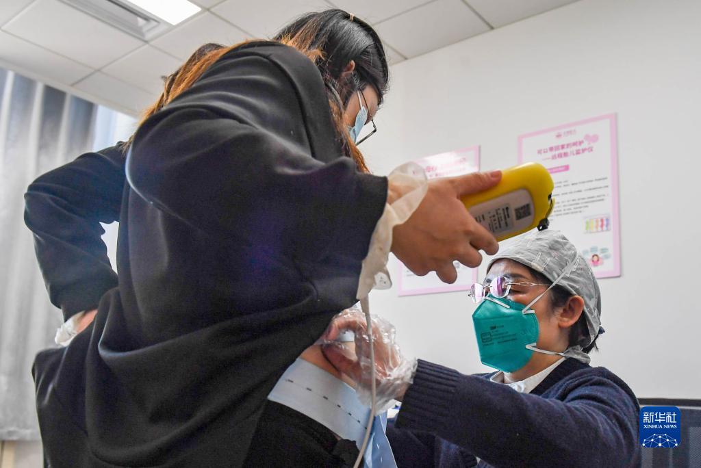 2月23日,在呼和浩特市婦幼保健院婦產(chǎn)科內,醫務(wù)人員準備為孕婦做胎心監測。