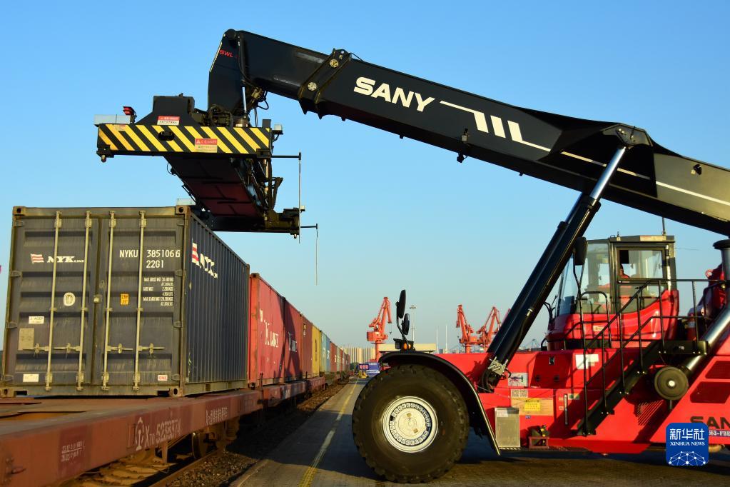 2月20日,在山東港口物流集團海鐵聯(lián)運中心,貨運列車(chē)在卸貨。