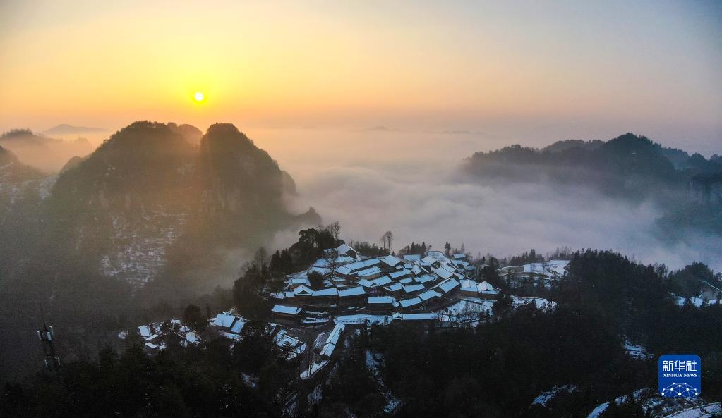 2月24日早上拍攝的湖南省湘西土家族苗族自治州花垣縣雙龍鎮十八洞村雪后日出(無(wú)人機照片)。