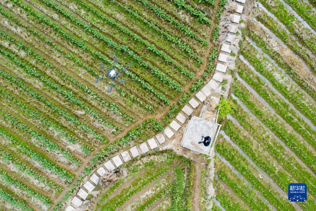 2月24日,在四川省閬中市江南街道,無(wú)人機在油菜地上空作業(yè)(無(wú)人機照片)。