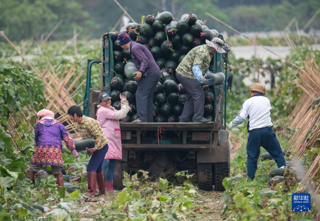 2月24日,海南省瓊海市潭門(mén)鎮的農民在裝運冬瓜。