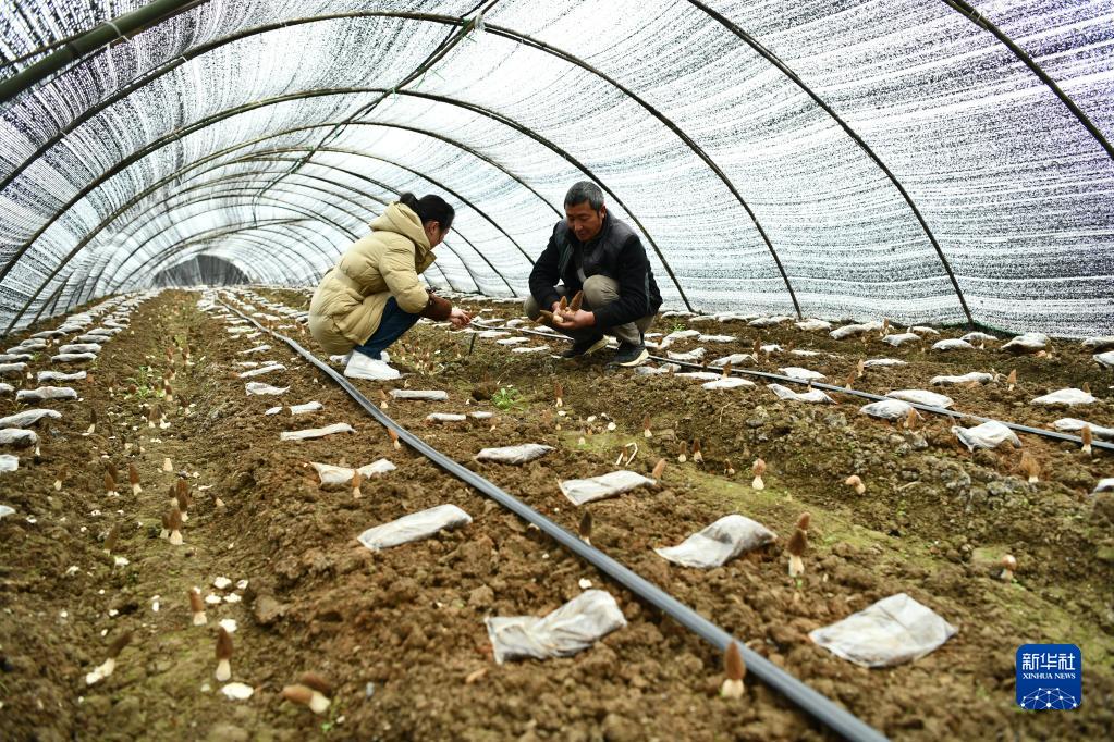 2月26日,在貴州省遵義市一現代農業(yè)產(chǎn)業(yè)園區,村民在大棚里采收羊肚菌。