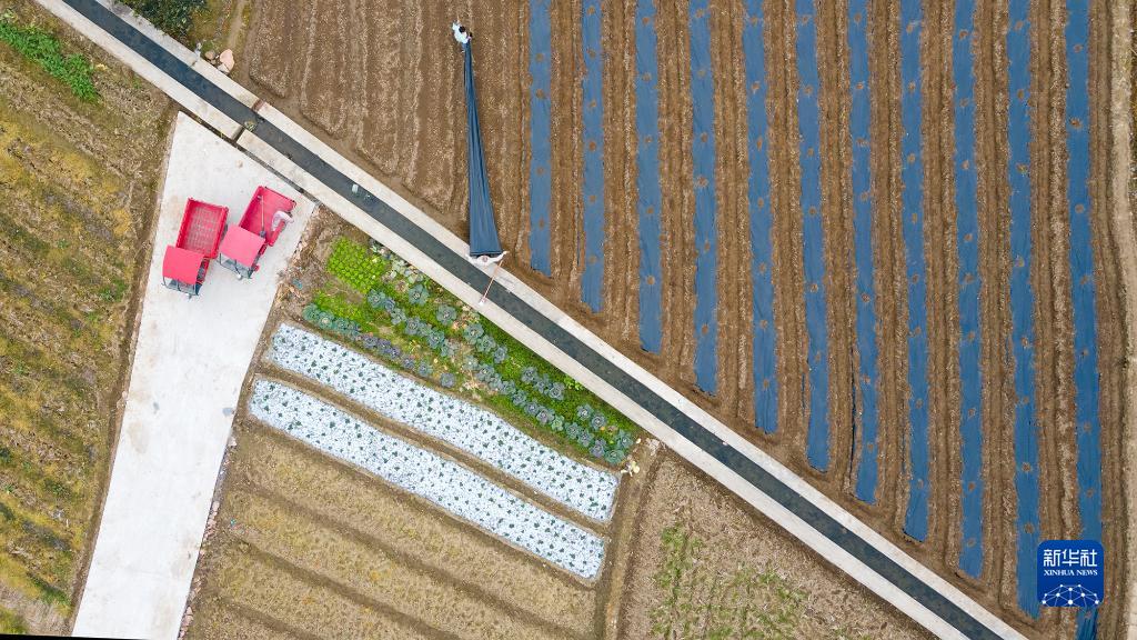 2月27日,在貴州省遵義市余慶縣白泥鎮團結村,村民在地里勞作(無(wú)人機照片)。