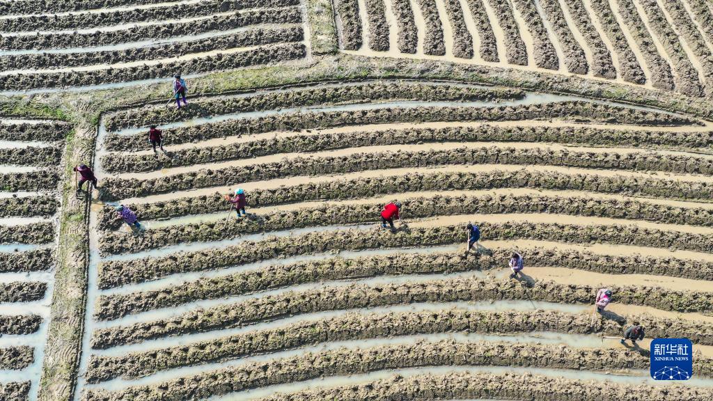 2月27日,湖南省衡陽(yáng)市常寧市西嶺鎮石江村村民在田間勞作(無(wú)人機照片)。
