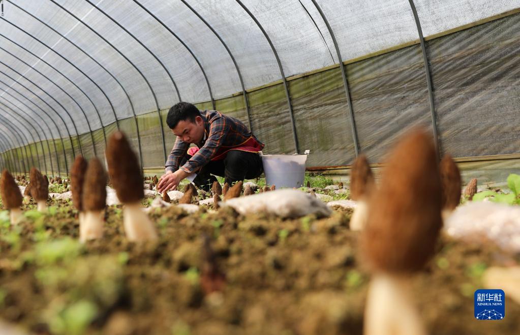 2月28日,村民在貴州省黔西市金蘭鎮龍山村羊肚菌種植基地采收羊肚菌。