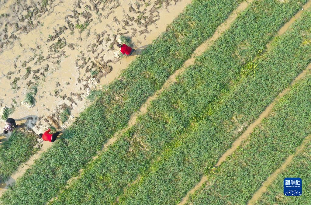 2月28日,在湖南省道縣營(yíng)江街道白地頭社區,農民在田間勞作(無(wú)人機照片)。
