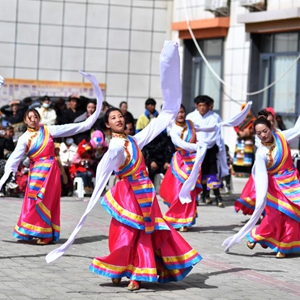 搬遷牧民在搬遷點(diǎn)廣場(chǎng)上跳起民族舞蹈,迎接藏歷新年(2月28日攝)。