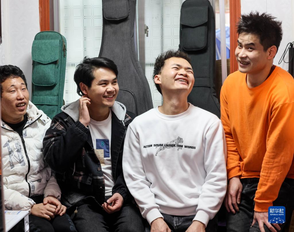 3月1日,“折耳根”樂(lè )隊主唱陳克興(左一)、吉他手楊志(右二)、鼓手陳昌海(右一)、貝斯手彭萬(wàn)海(左二)在推拿店內休息。