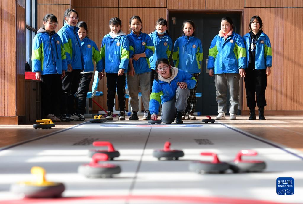 3月2日,在肥西縣嚴店中心學(xué)校少年宮,學(xué)生體驗旱地冰壺。