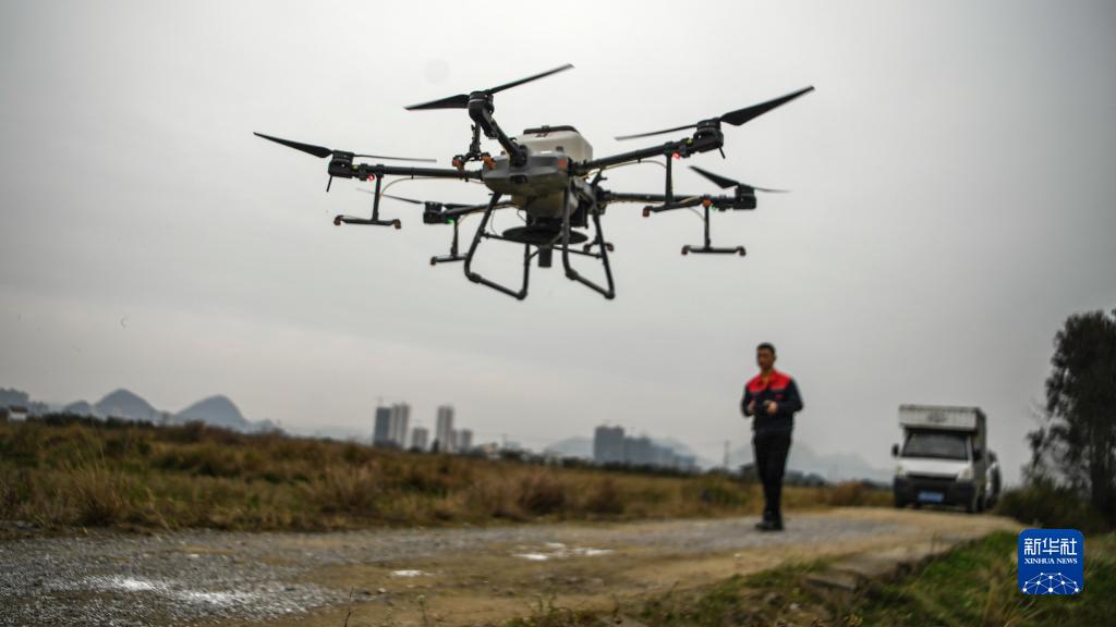3月2日,在廣西融安縣長(cháng)安鎮大巷村,一名農民遙控植保機給農田施肥。