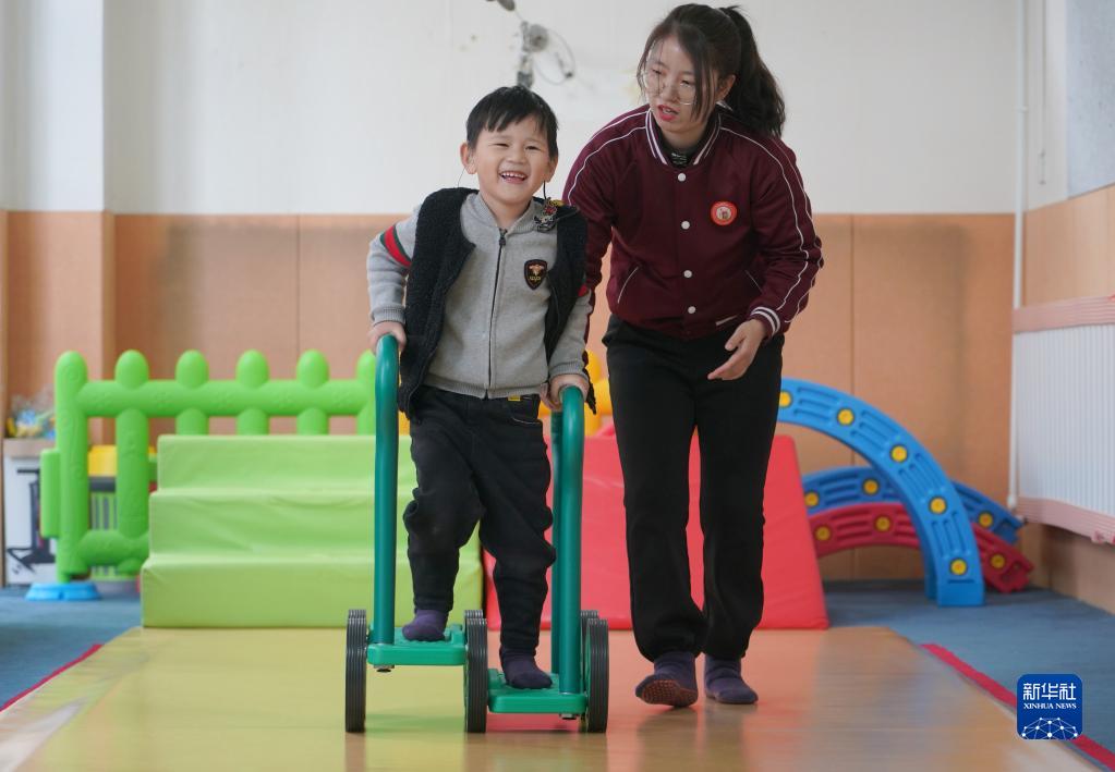 3月2日,在西安市蓮湖區愛(ài)爾堡幼兒園,一名聽(tīng)障兒童在老師的幫助下進(jìn)行感統失調訓練課程。