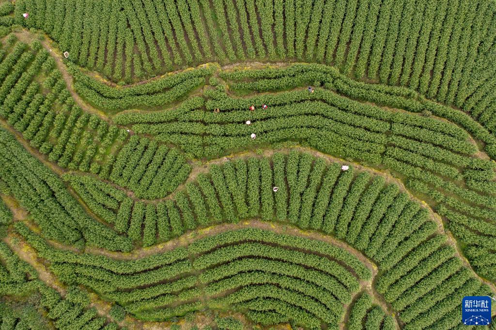 3月3日,村民在景寧縣鶴溪街道敕木山村茶園采茶(無(wú)人機照片)。