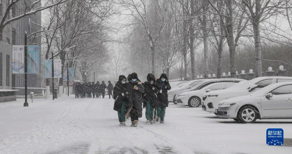圖為重慶市特殊教育中心揚帆管樂(lè )團參演團隊在北京冒雪前往排練場(chǎng)館(2月13日攝)。