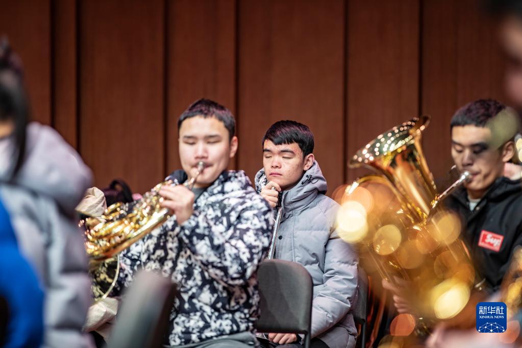 圖為在重慶市特殊教育中心揚帆音樂(lè )廳,揚帆管樂(lè )團小號手王太樊(中)和同學(xué)們在練習國際殘奧委會(huì )會(huì )歌《未來(lái)贊美詩(shī)》(1月24日攝)。