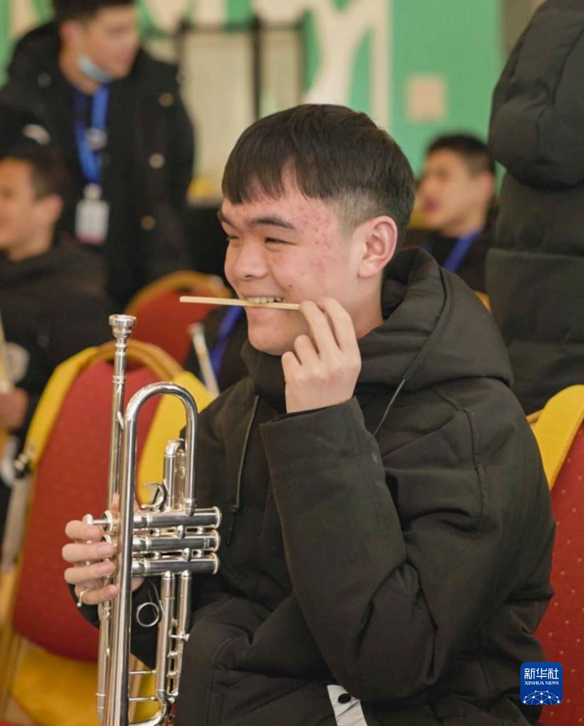 圖為在北京排練場(chǎng)館內,重慶市特殊教育中心揚帆管樂(lè )團小號手王太樊以銜筷子的方式練習微笑(2月14日攝)。