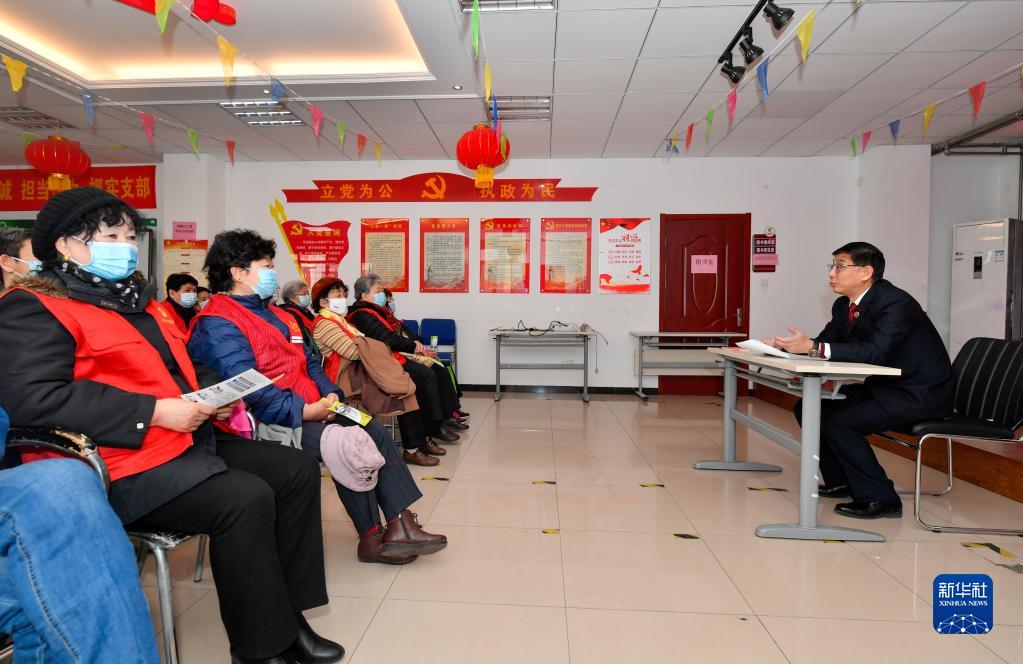 3月8日,在天津市南開(kāi)區向陽(yáng)路街道大園新居社區居委會(huì ),天津市南開(kāi)區人民檢察院檢察官刁智(右)向居民宣講《中華人民共和國反有組織犯罪法》。
