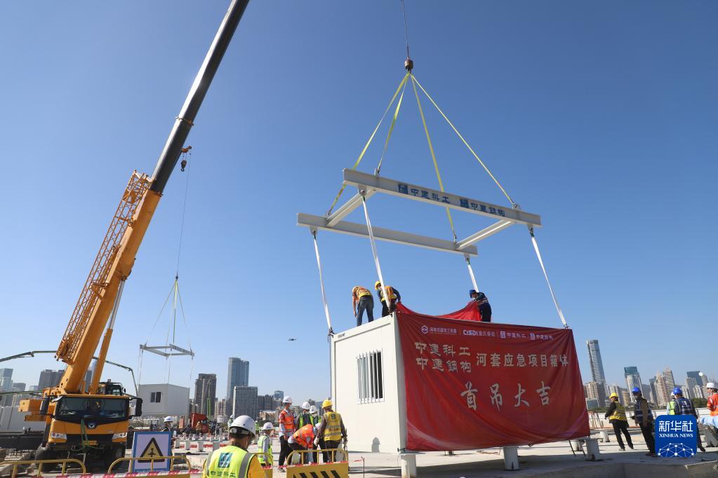 3月9日,中央援建香港應急醫院項目首個(gè)集成式箱體吊裝施工現場(chǎng)。