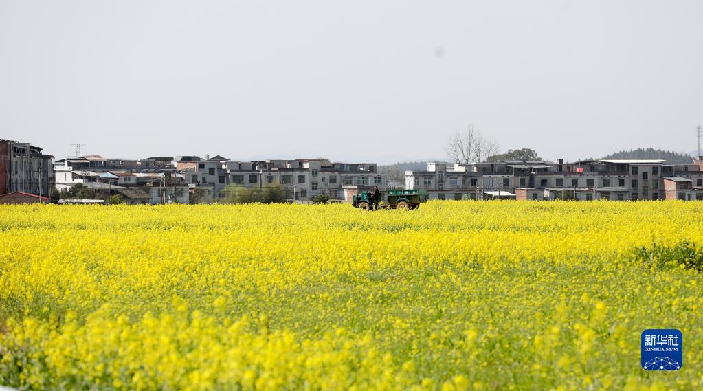 3月9日,湖南省資興市蓼江鎮農戶(hù)駕駛拖拉機從油菜花海中穿過(guò)。