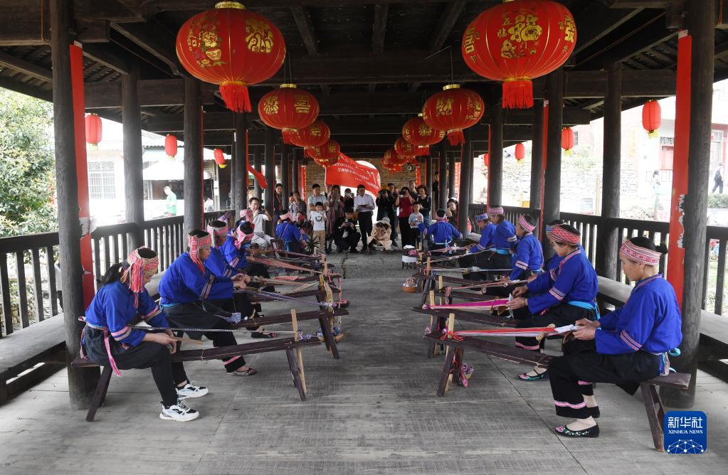 在廣西賀州市富川瑤族自治縣朝東鎮岔山村,當地村民為游客展示民族紡織技藝(3月12日攝)。