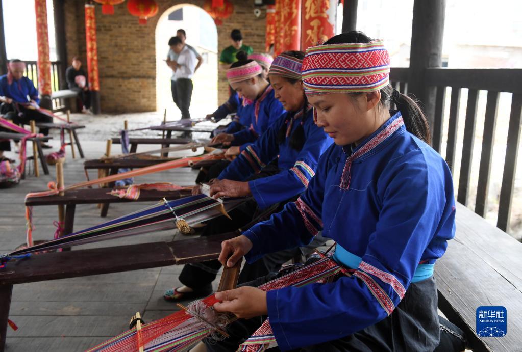 在廣西賀州市富川瑤族自治縣朝東鎮岔山村,當地村民為游客展示民族紡織技藝(3月12日攝)。