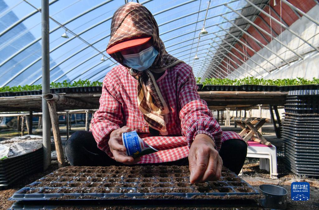 3月14日,在天津市寧河區苗莊鎮一家種苗培育基地,農民在穴盤(pán)里播種育苗。