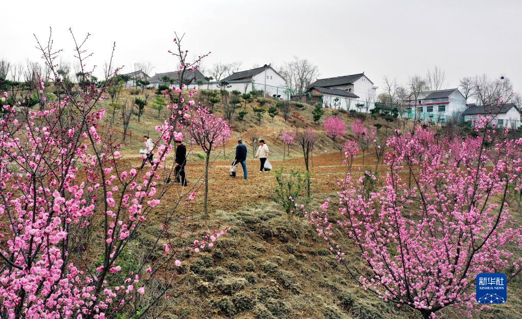 3月14日,在洛南縣永豐鎮冀洼村,村民在平整土地準備種植中草藥材(無(wú)人機照片)。