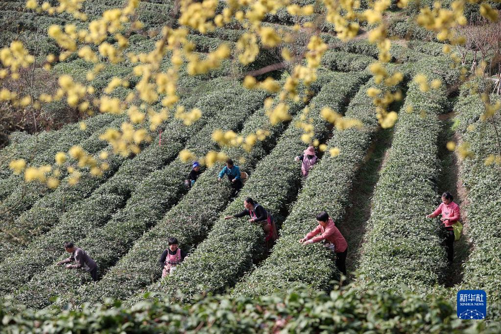 3月15日,村民在貴州省黔東南苗族侗族自治州丹寨縣龍泉鎮馬寨茶園采摘春茶。