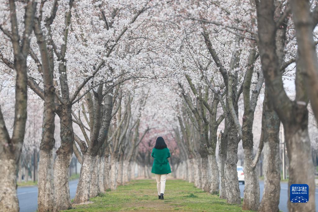 3月16日,市民在位于江蘇省揚州市鑒真路的櫻花大道上賞花。