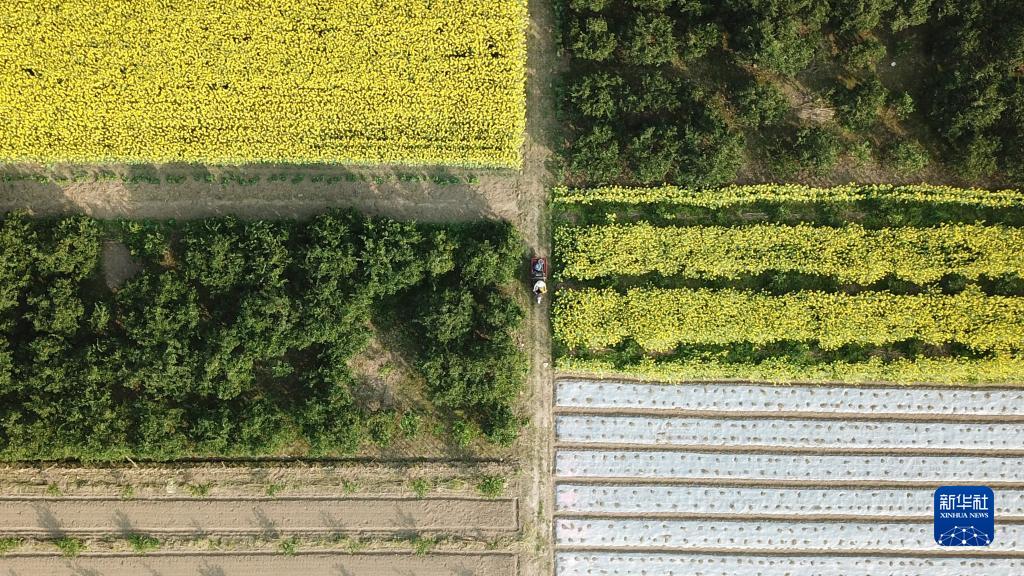 在常德市石門(mén)縣葉家坪村,葉金娥騎著(zhù)三輪車(chē)在田間穿行(3月15日攝,無(wú)人機照片)。