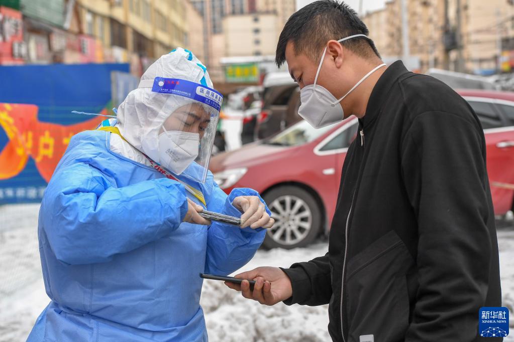 3月18日,吉林市黨員志愿者張騫文(左)在社區核酸檢測采樣點(diǎn)為居民掃碼登記。