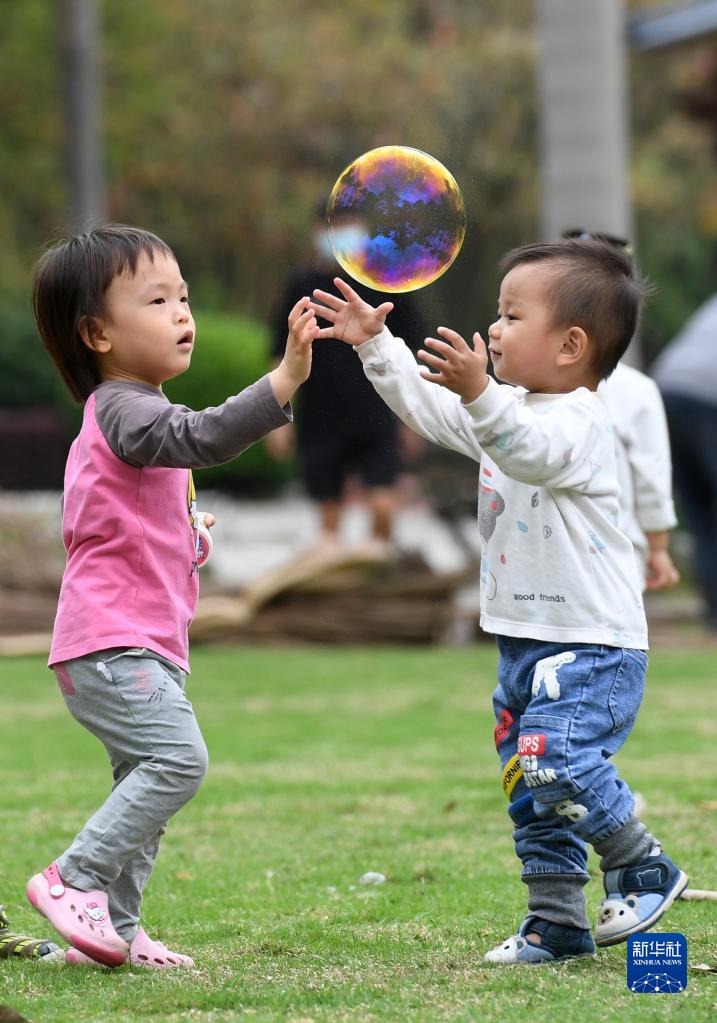 3月20日,小朋友在廣西南寧市金花茶公園玩耍。