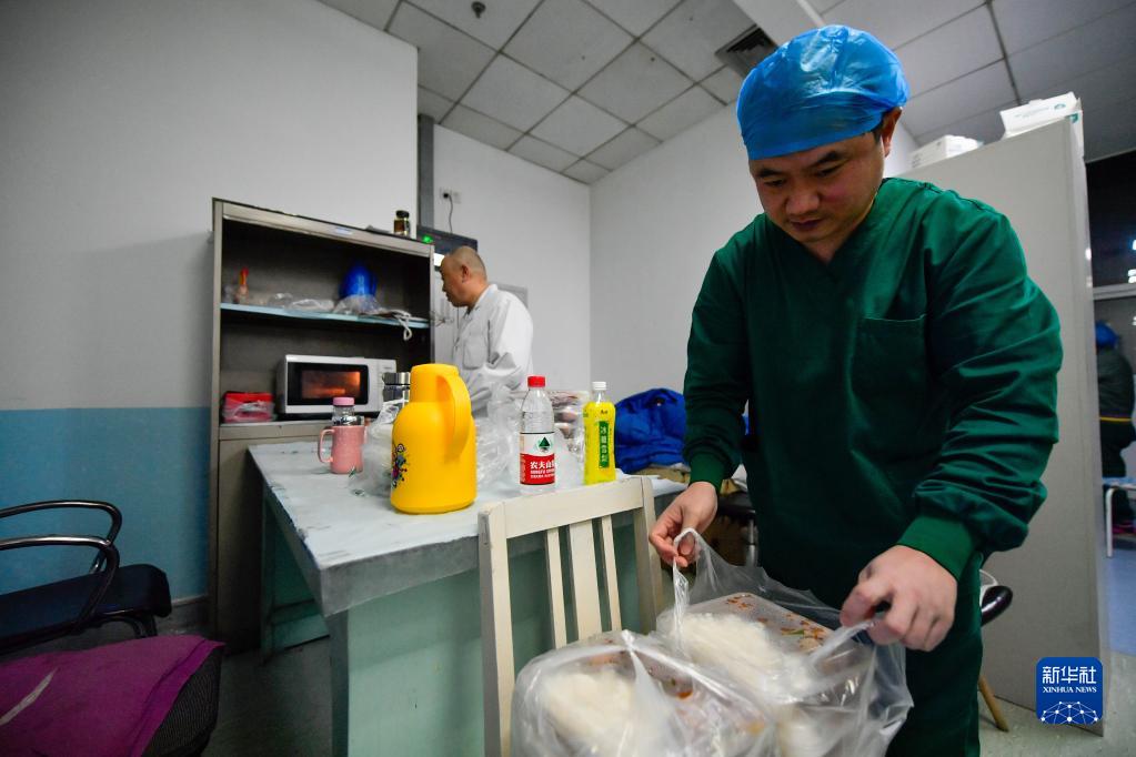 3月19日晚,在天津市第一醫院休息室,換班的工作人員在加熱晚餐。