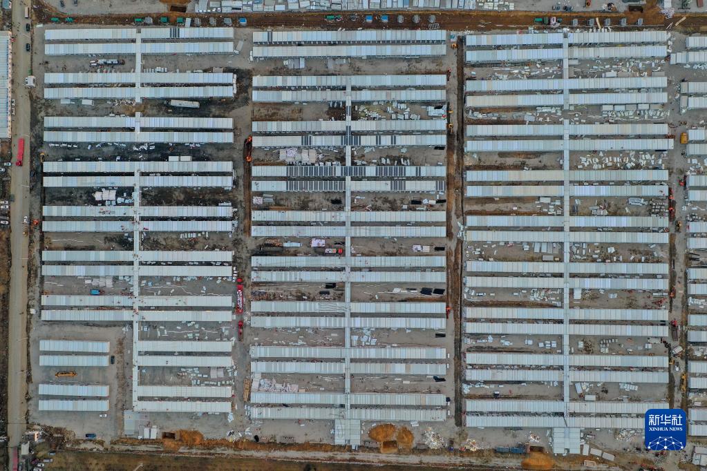 這是3月20日傍晚拍攝的吉林市高新南區隔離方艙建設現場(chǎng)(無(wú)人機照片)。