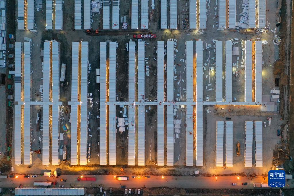 這是3月20日傍晚拍攝的吉林市高新南區隔離方艙建設現場(chǎng)(無(wú)人機照片)。