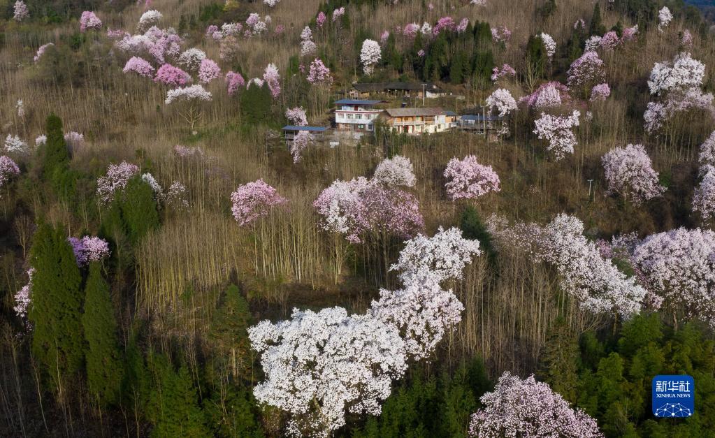 3月23日拍攝的江油市大康鎮戴天山村的辛夷花和民居(無(wú)人機照片)。