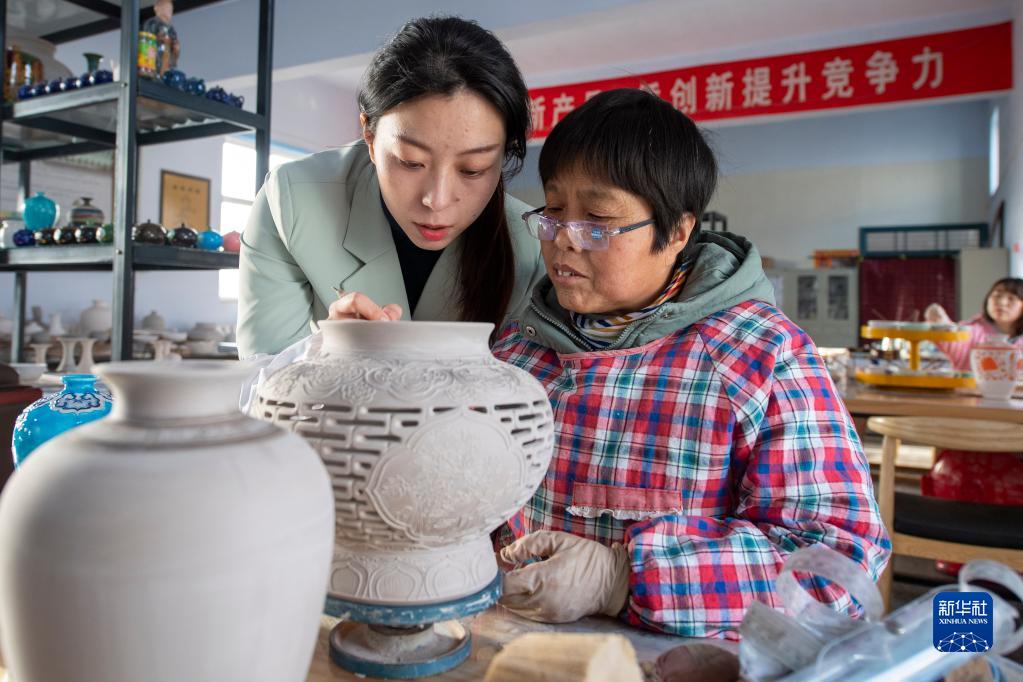 3月23日,在山西省陽(yáng)城縣沙坡村,喬琳(左)和工作人員交流琺華制作技巧。新華社記者 楊晨光 攝
