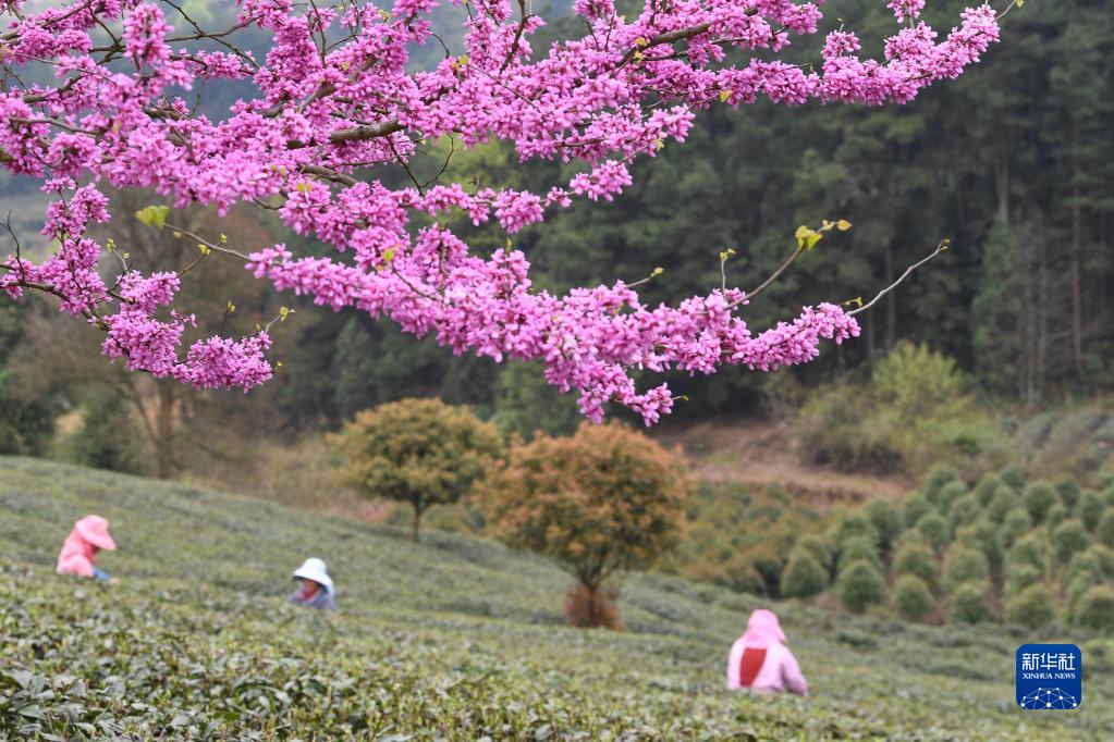 3月24日,茶農在貴州省遵義市余慶縣松煙鎮二龍茶山采摘明前茶。