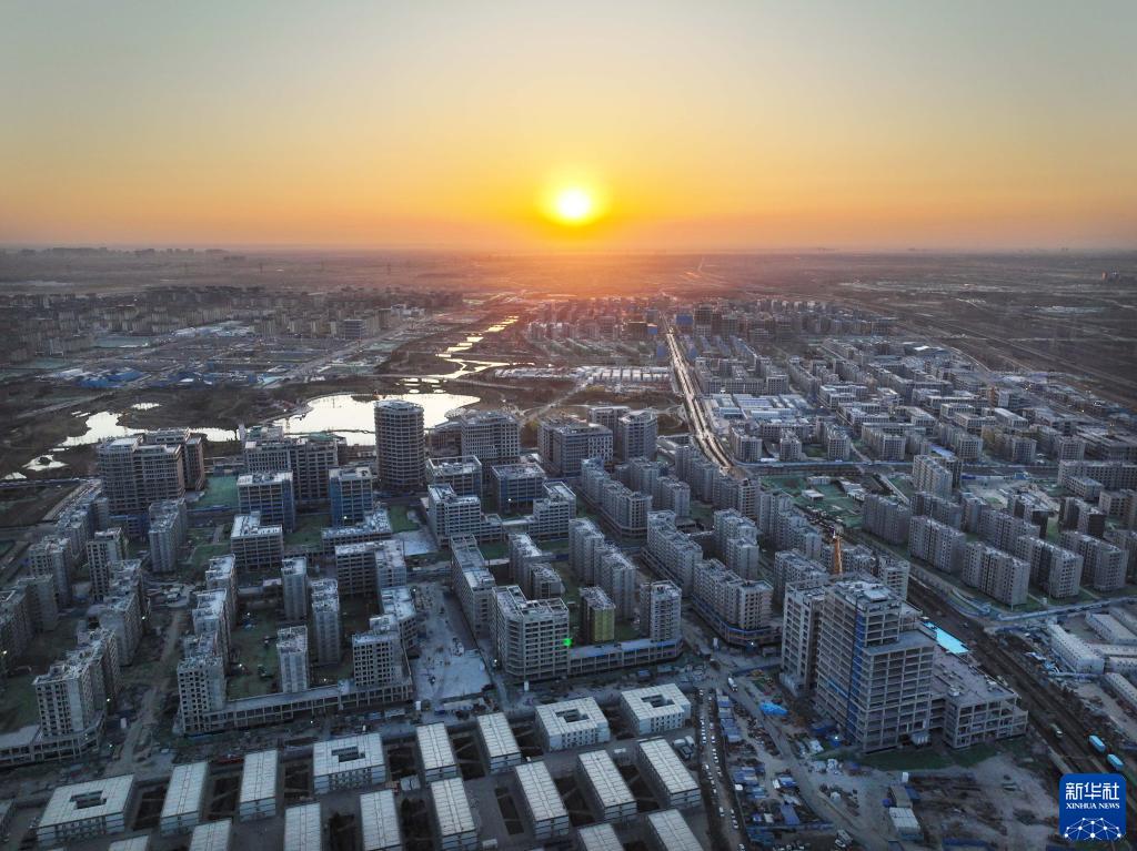 4月1日在雄安新區拍攝的日出(無(wú)人機照片)。