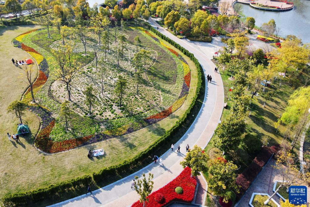 4月4日,市民在江蘇省如皋市龍游河生態(tài)公園游玩(無(wú)人機照片)。
