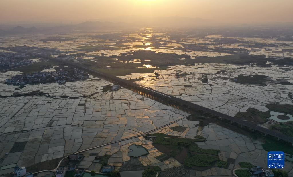 一列動(dòng)車(chē)組列車(chē)在廣西南寧市賓陽(yáng)縣古辣鎮的田野上行駛(4月4日攝,無(wú)人機照片)。