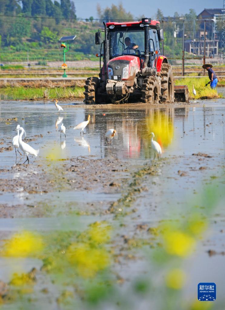 4月10日,在浙江省糧食生產(chǎn)功能區臺州市仙居縣下各鎮馬垟片農田,農民駕駛農機翻耕水田,準備播種早稻。