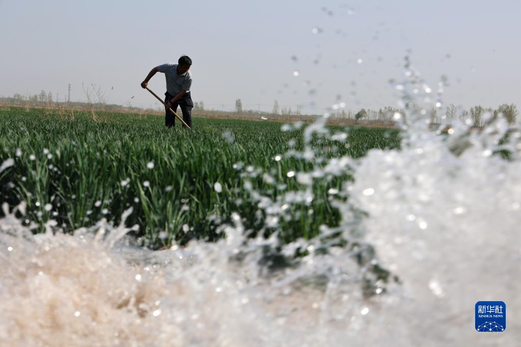 4月10日,山東省濱州市博興縣龐家鎮高廟李村農民在灌溉小麥。