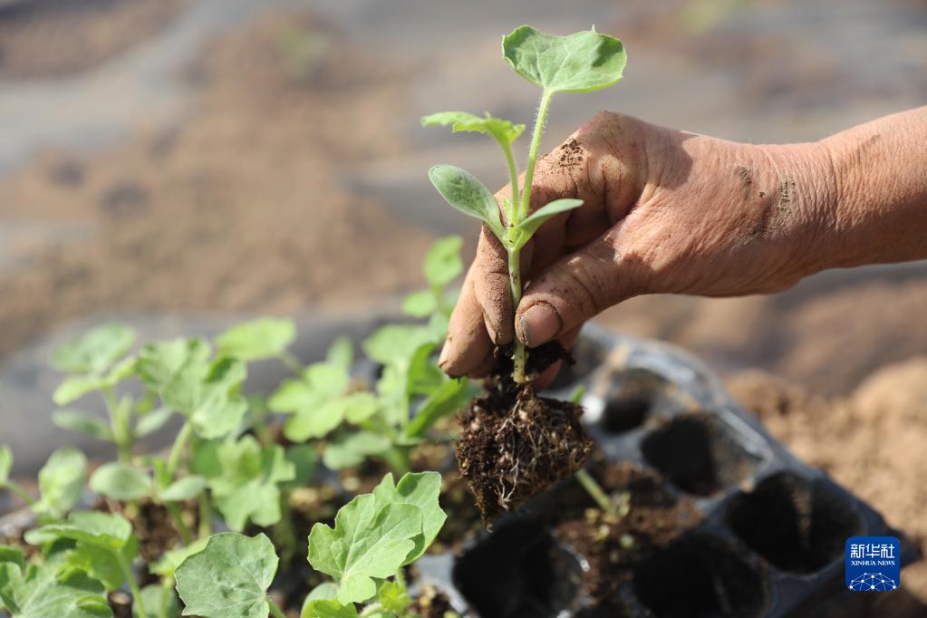 4月10日,河南省焦作市溫縣趙堡鎮南孟封村農民在田間移栽西瓜苗。