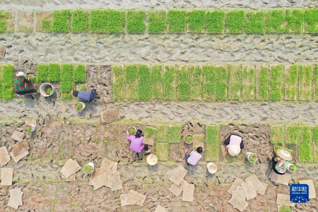 4月10日,在湖南省永州市道縣營(yíng)江街道濂南村,村民在早稻秧田里扯秧苗(無(wú)人機照片)。