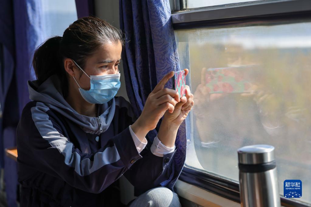 在開(kāi)往烏魯木齊方向的“和田玉龍號”列車(chē)上,乘客在拍攝沿途風(fēng)景(4月29日攝)。
