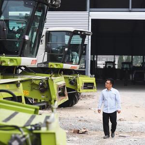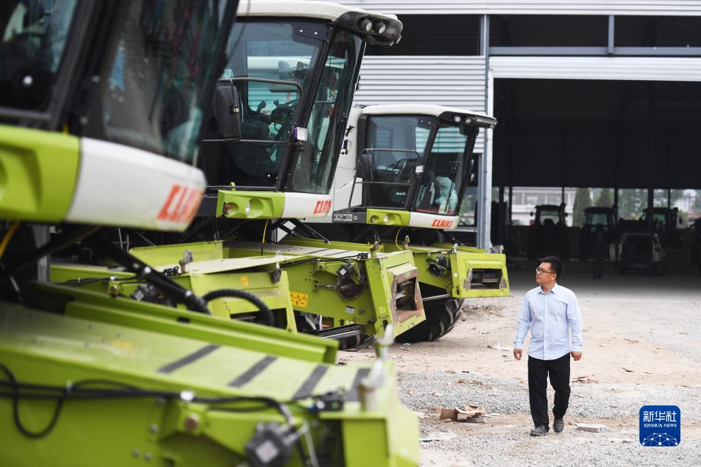 5月25日,沈興新在位于河南省鄧州市的公司農機設備停放處查看農機設備。