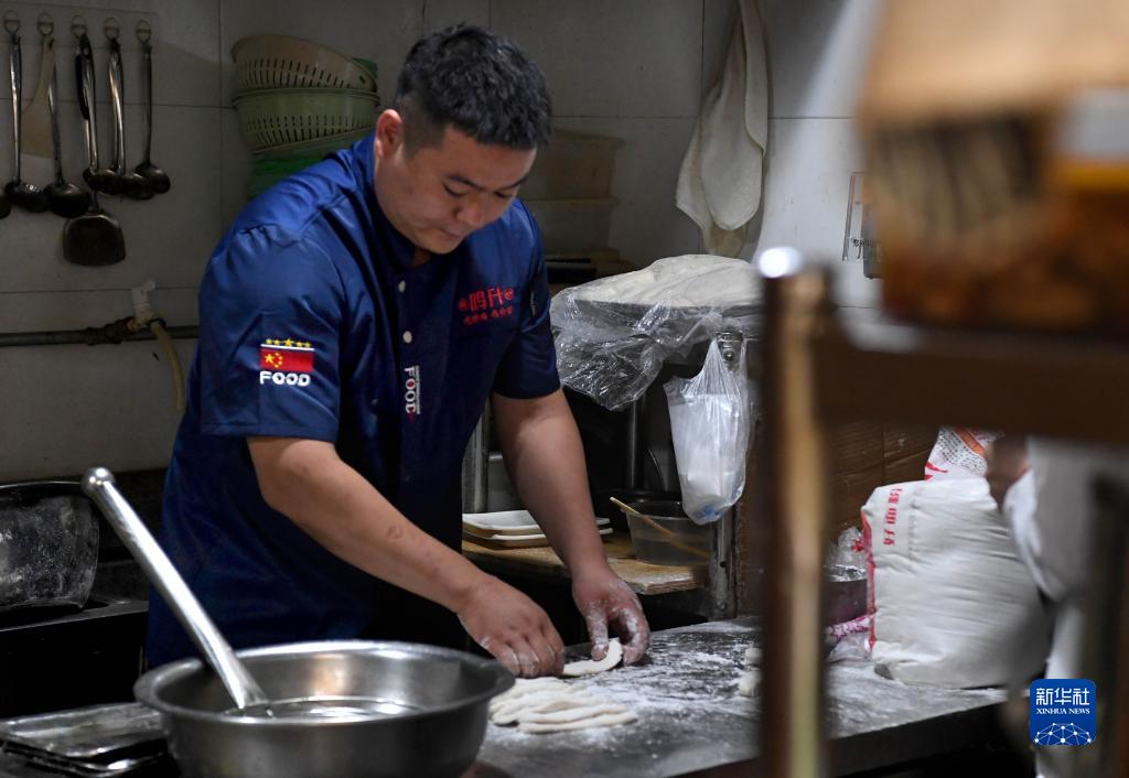 張占領(lǐng)在位于鄭州市二七區的店鋪內制作面食(5月31日攝)。