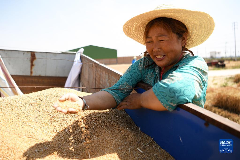 6月7日,牛玉蘋(píng)看著(zhù)收獲的新麥,露出了笑容。
