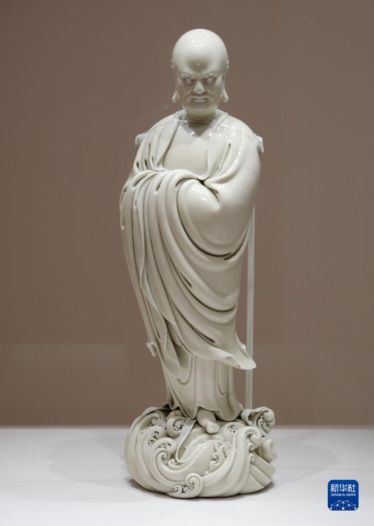 6月28日在香港故宮文化博物館拍攝的明代德化窯白釉達摩渡江立像。